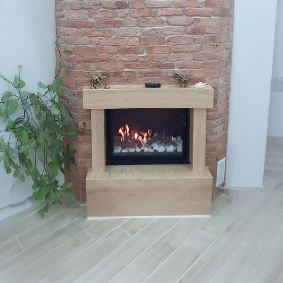 Tuğla örmeli traverten giydirmeli rustik şömine